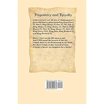 Pageantry and Royalty-- Collected here are all ten of Shakespeare's powerful history plays including King Henry IV, Part 1; King Henry IV, Part 2; The Life of King Henry V; King Henry VI, Part 1; King Henry VI, Part 2; King Henry VI, Part 3; King Henry VIII; King John; King Richard II; and King Richard III.